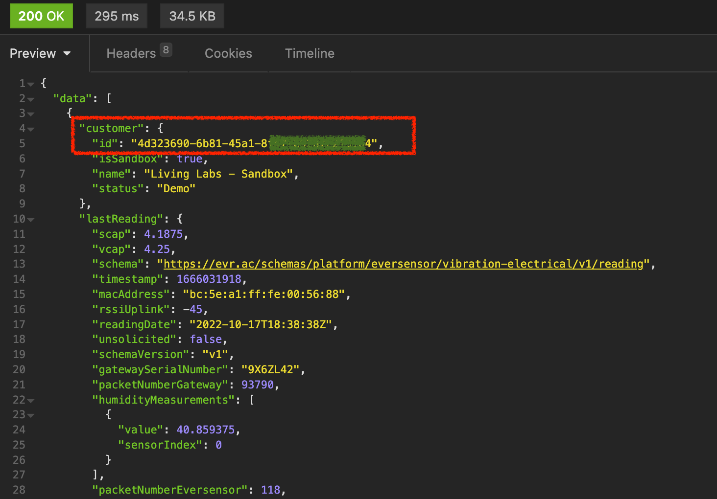 The response is an array of Eversensor data that includes, for every sensor, its last reading and the associated customer account. Take note of the customer id, (we will use 4d323690-6b81-45a1-8000-000000000000 for this example) we will use it in our MQTT subscription.