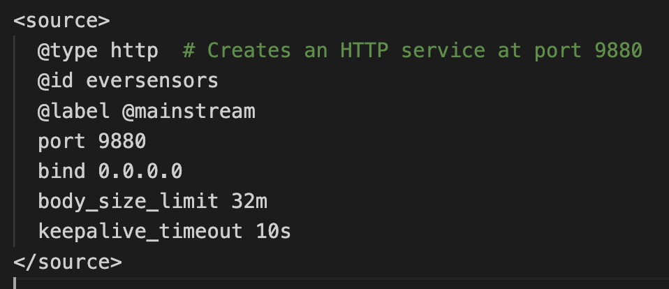 The file fluentd-s3-docker/fluentd/flow.conf contains all the configuration for the flow we are building. The flow starts with an HTTP input source on port 9880.