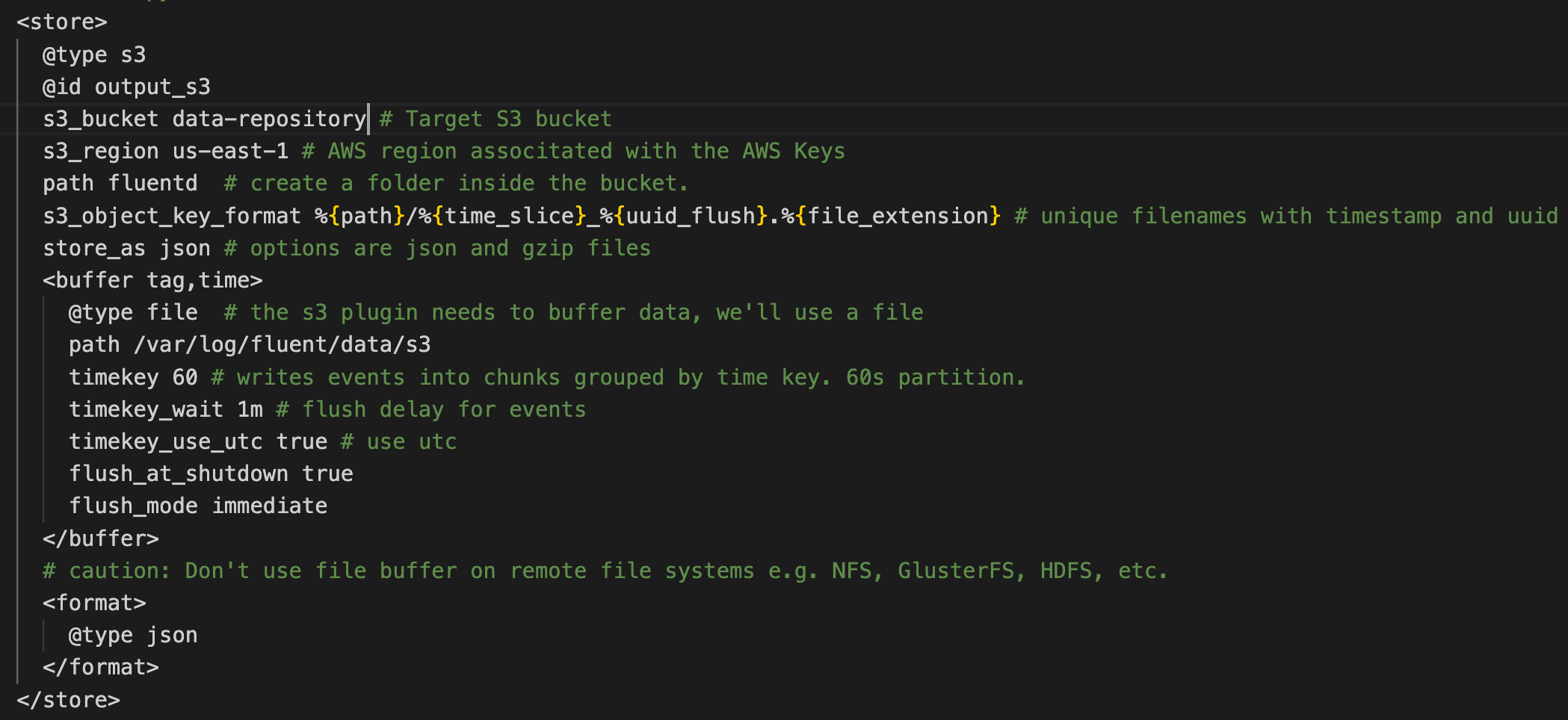 Every message is received and sent to an S3 output plugin. This is a store plugin, designed to aggregate messages in a buffer before sending them to the storage destination. Using a buffer is very important because we don’t want to push to S3 on every single sensor reading - that could be costly- instead, we want to aggregate messages and then push one file with the set. In our example we will push to the S3 bucket data-repository every 60 seconds.