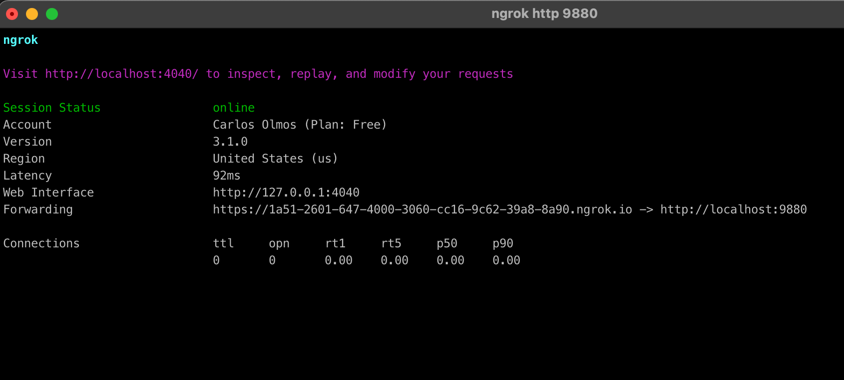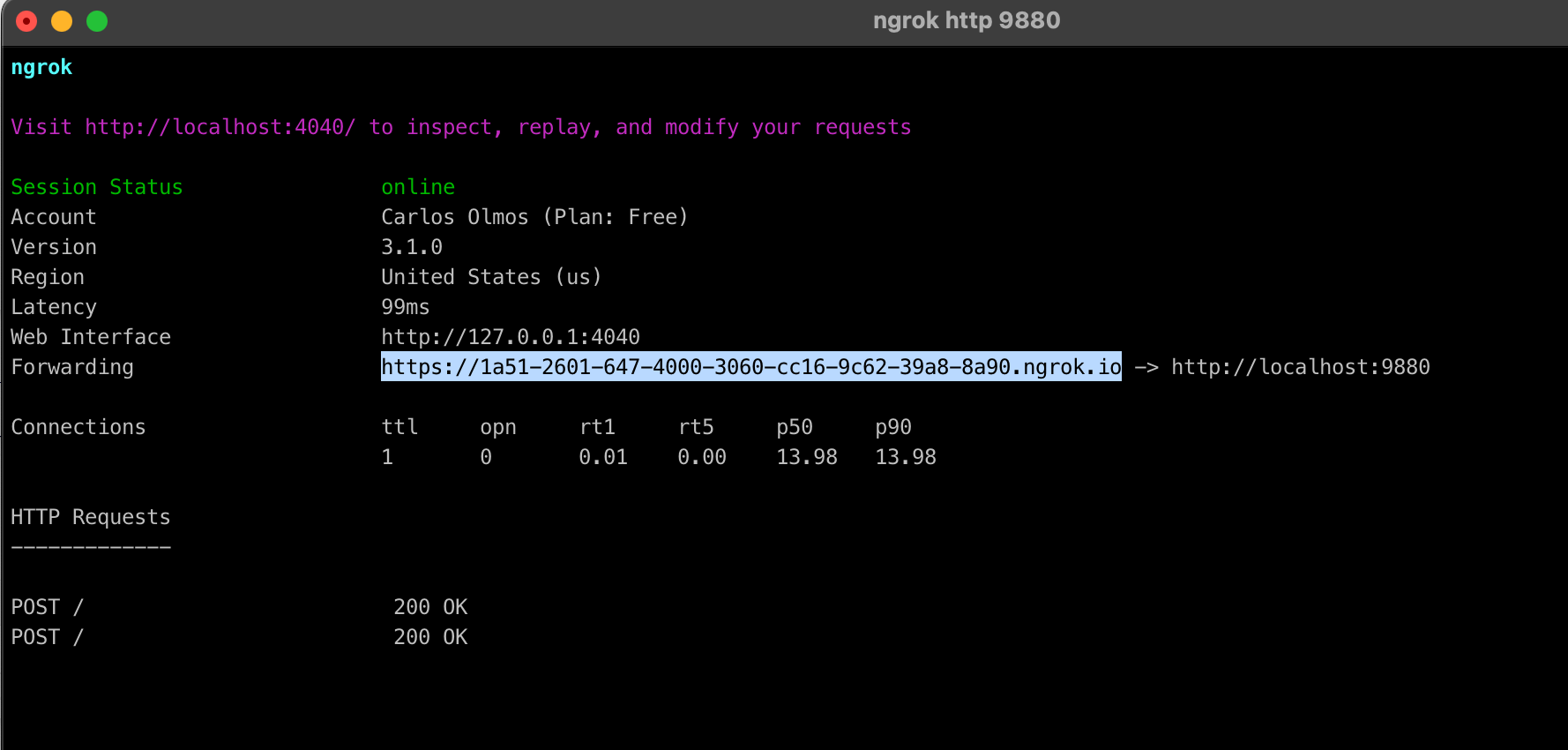 ngrok creates a public URL https://1a51-2601-647-4000-3060-cc16-9c62-39a8-8a90.ngrok.io routing traffic to our local service.