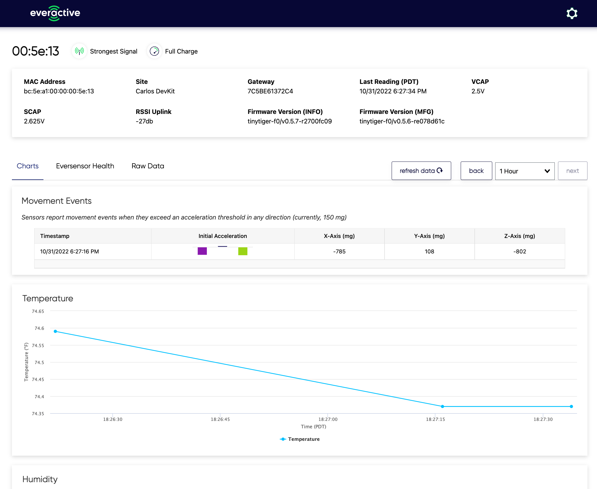 You can see the activity from the Eversensor in the sensor details panel of the Developer Console. Here you can see the most recent data that is coming from the sensor.