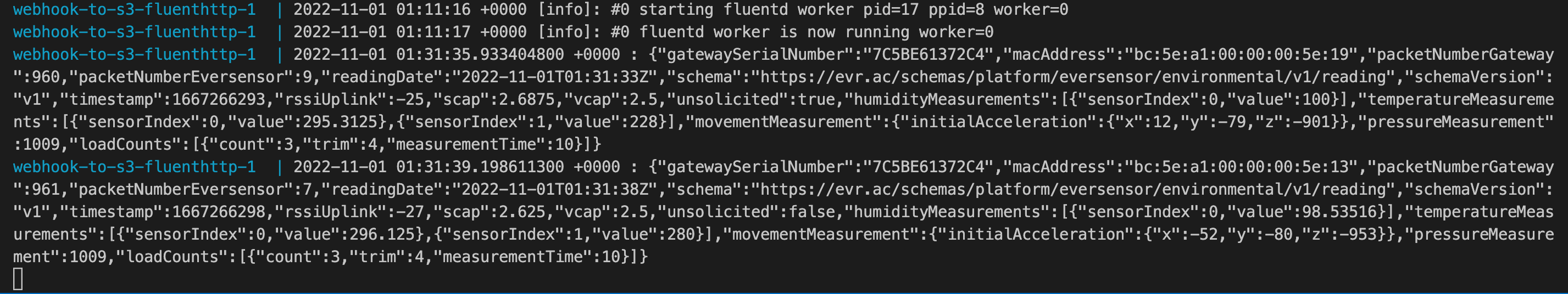 The Webhook will be triggered every time a new sensor reading is received. The request will be sent to a fluentd HTTP input listener. Finally, a fluentd S3 output will upload the files to AWS S3.