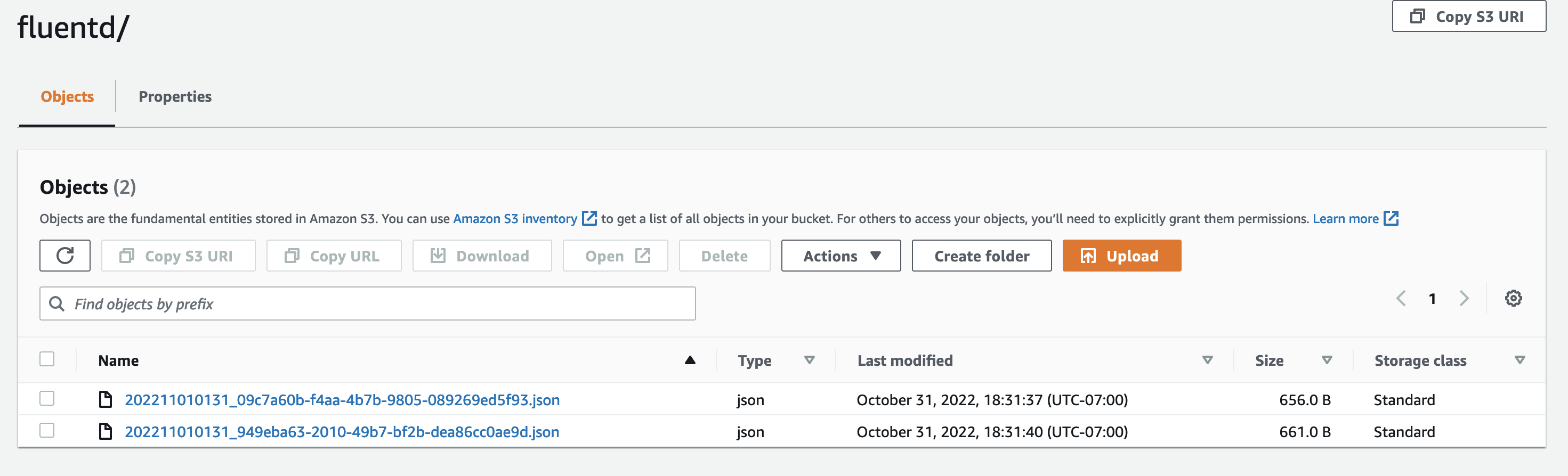 Finally, after 60 seconds have passed, we should be able to see files in the S3 bucket we setup in fluentd.